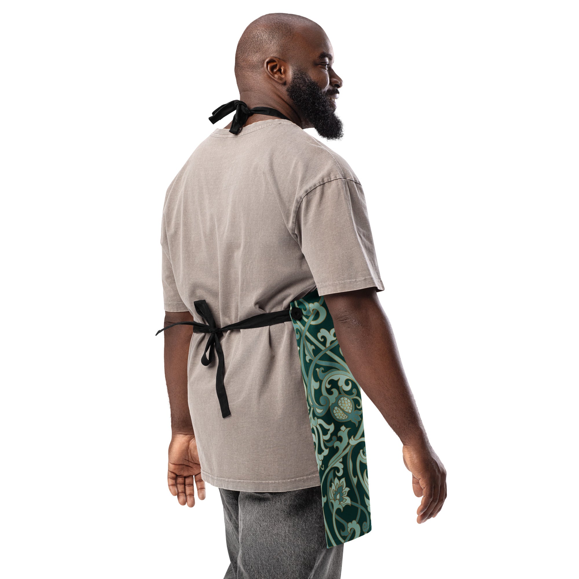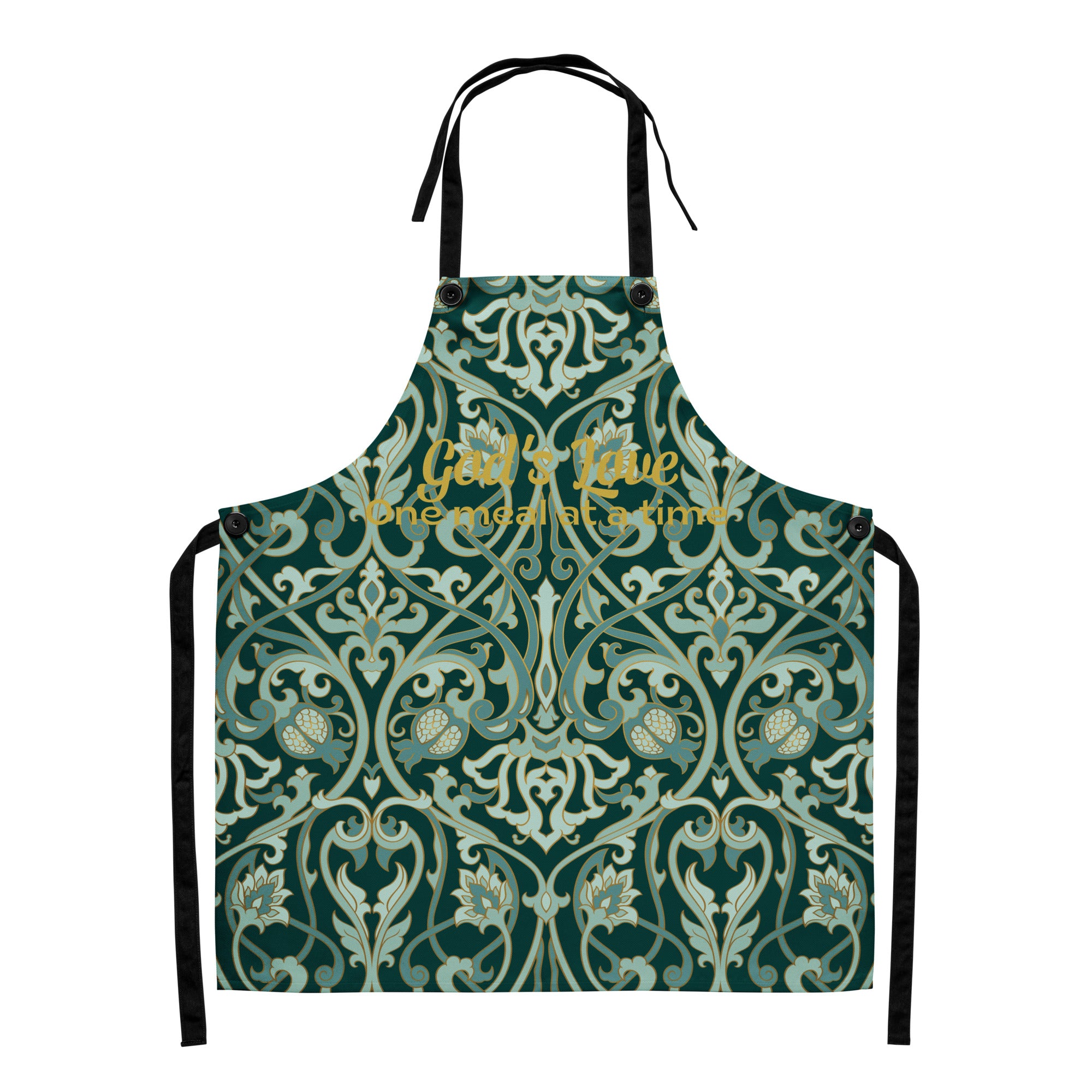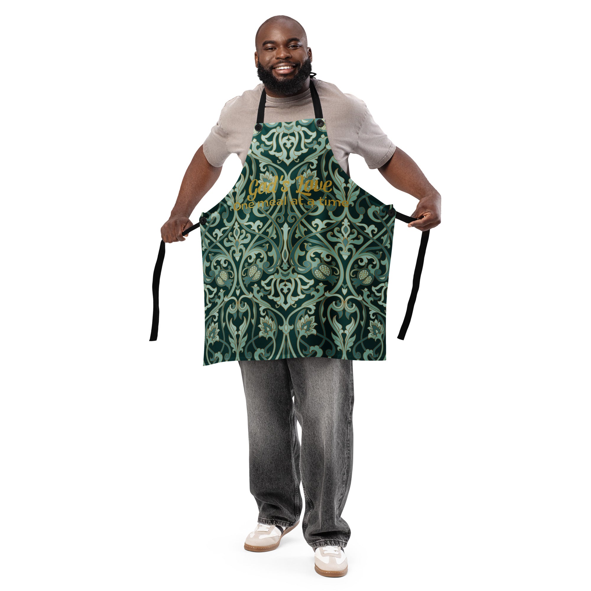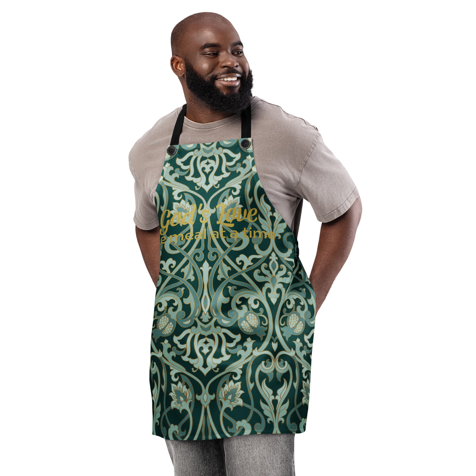 Cook with purpose and grace in God’s Love  One Meal at a Time apron. Featuring an elegant sage and emerald baroque pattern with golden script, this apron blends timeless style with spiritual warmth. Designed for both comfort and durability, it’s the perfect companion for anyone who believes that love and faith begin in the kitchen.