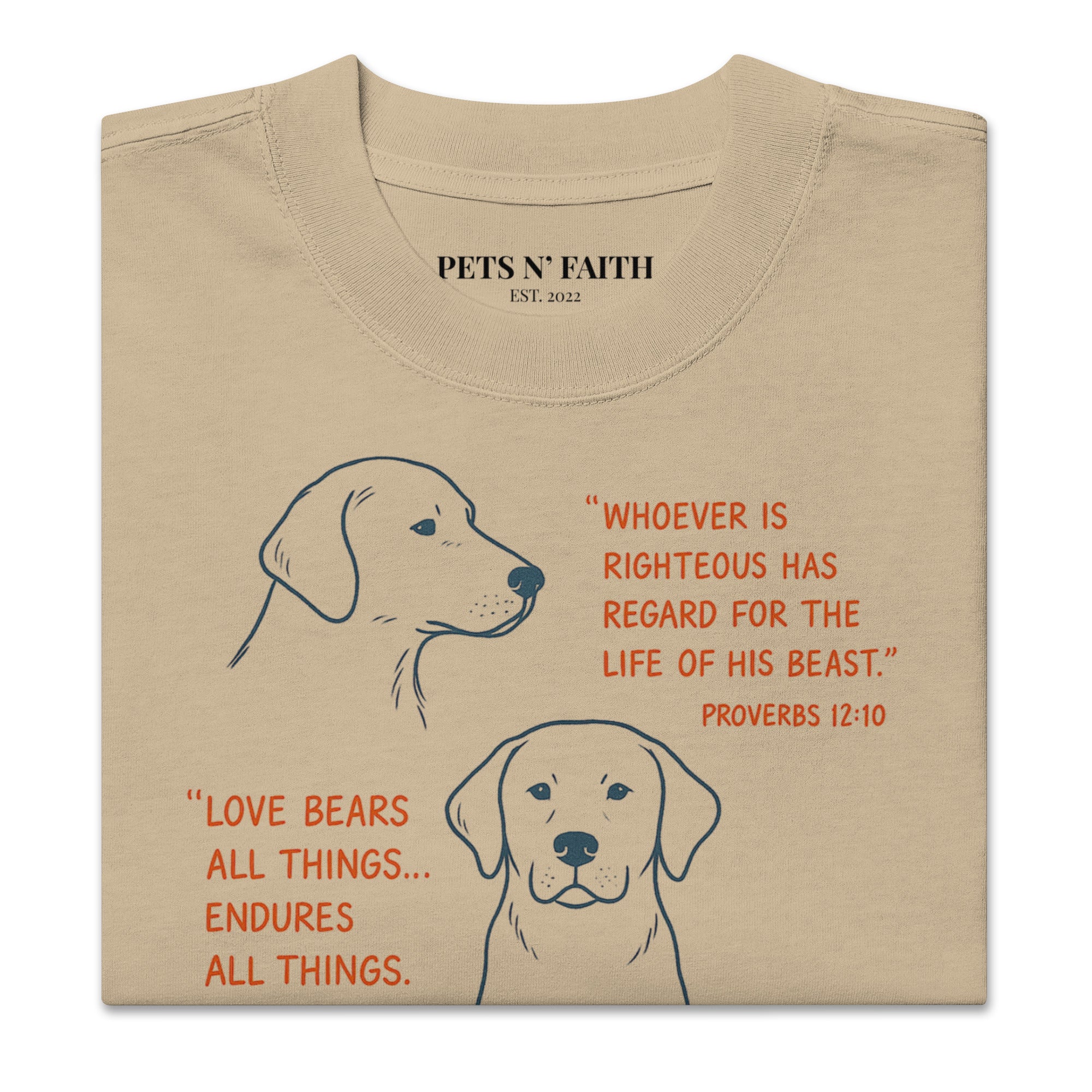 Celebrate faith and furry friends with the God's Words & Gentle Paws Oversized Faded T-Shirt. Featuring hand-drawn dog illustrations alongside meaningful Bible verses, this tee blends timeless style with spiritual inspiration. Its garment-dyed, pre-shrunk cotton delivers a soft, lived-in feel from the first wear, while the boxy, oversized fit and dropped shoulders make it ideal for layering or relaxed everyday looks. Perfect for believers who love their pets, this shirt reminds you to walk in faith and love.