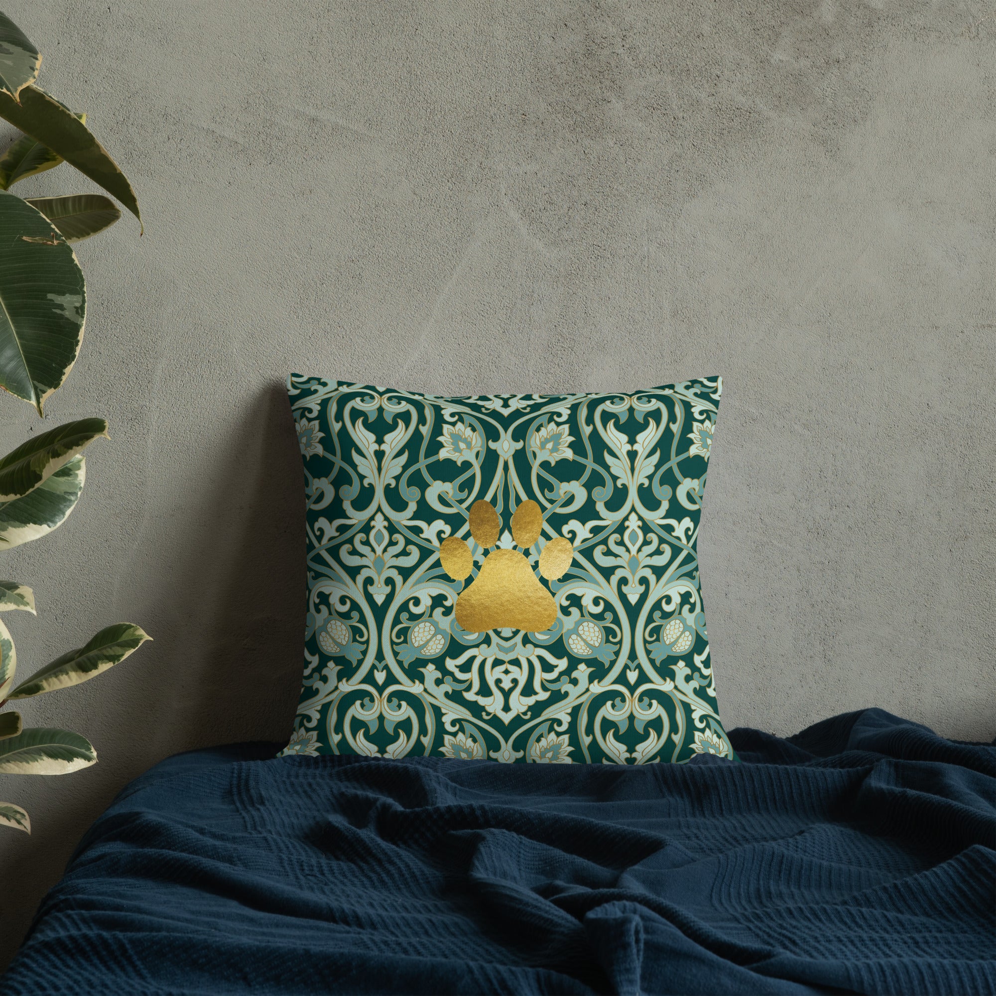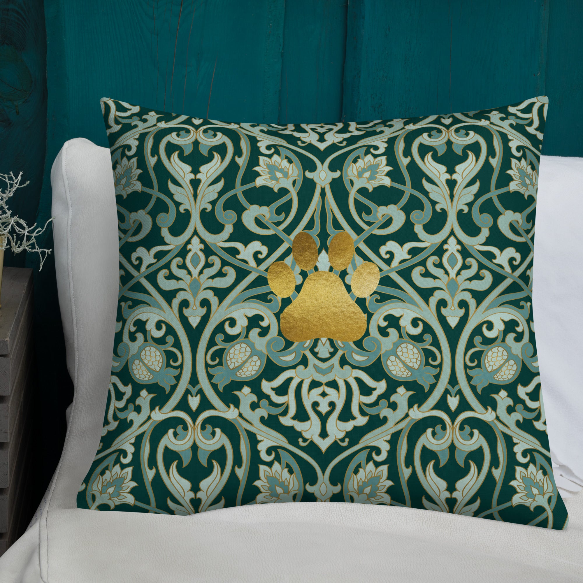 Bring timeless grace and faith-filled charm into your space with the Golden Paw Damask Premium Pillow. Featuring a radiant gold paw print atop a richly detailed damask pattern, this luxurious accent pillow adds warmth, elegance, and devotion to your home. Perfect for pet lovers who believe that love and paws make a house a home. This accent pillow pairs well with our Golden Paw Damask Sherpa Blanket.